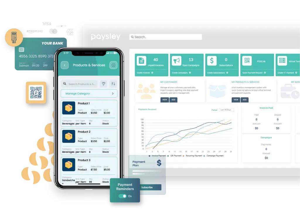 Paysley’s all-in-one payment solution is designed to adapt to the unique demands of your business, whether you operate online, in-person, or across multiple channels. Our platform ensures that every transaction is handled smoothly and securely, providing a consistent and efficient experience for both you and your customers. With Paysley, you can effortlessly manage payments, reduce checkout friction, and increase customer satisfaction—no matter where your business takes you. From processing online payments with ease to facilitating seamless in-store transactions, Paysley empowers your business to operate without limits, ensuring that you never miss a sale.